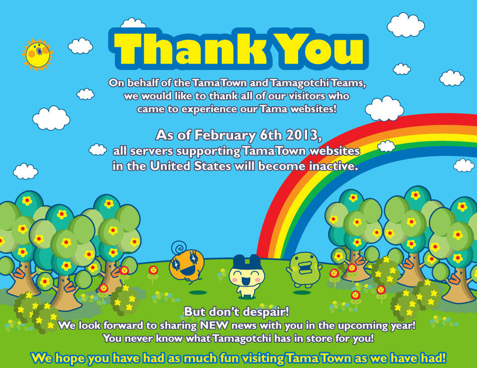 In mid-2012, reports begin to flood Tamagotchi forum sites claiming that users are struggling to log in to the US Tamatown sites - this includes the US versions of the V3 and V4 Tamatowns and the V6/7 Tamatown, with the latter being most frequently afflicted. This continues to persist for roughly half a year, and it begins to become clear that server maintenance isn't Bandai's priority anymore.